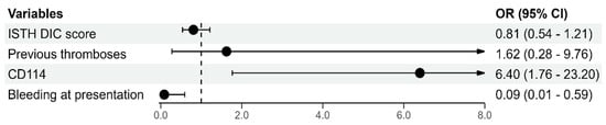 The clinical and laboratory features and comparison of patients with APL with and without VTEs are shown in Table 1 and Table 2. The patients with VTEs had significantly shorter PT (72.5% vs. 63.5%, p = 0.01), higher expression of the CD114 molecule (70.4% vs. 41.7%, p = 0.007), and lower ISTH DIC scores (5 vs. 6, p = 0.033). The absence of bleeding at presentation was also associated with VTE (17.9% vs. 5.5%, p = 0.43). Moreover, those patients diagnosed with VTEs during the course of the disease more often reported previous thrombotic events (14.3% vs. 3.1%, p = 0.042). There was no significant difference between the two groups regarding other parameters. The most significant risk factors for VTE occurrence in multivariate Cox’s proportional regression were CD114 expression (OR = 6.4, 95% CI: [1.8–23.2]) and the absence of bleeding at presentation (OR = 0.086, 95% CI: [0.01–0.59]), as shown in Figure 2, while the history of previous thromboses and DIC showed no significance. None of the RAMs were predictive in our cohort. The C statistics values for Al-Ani’s model and Paterno’s RAM were ROC = 0.514 and ROC = 0.521, respectively.