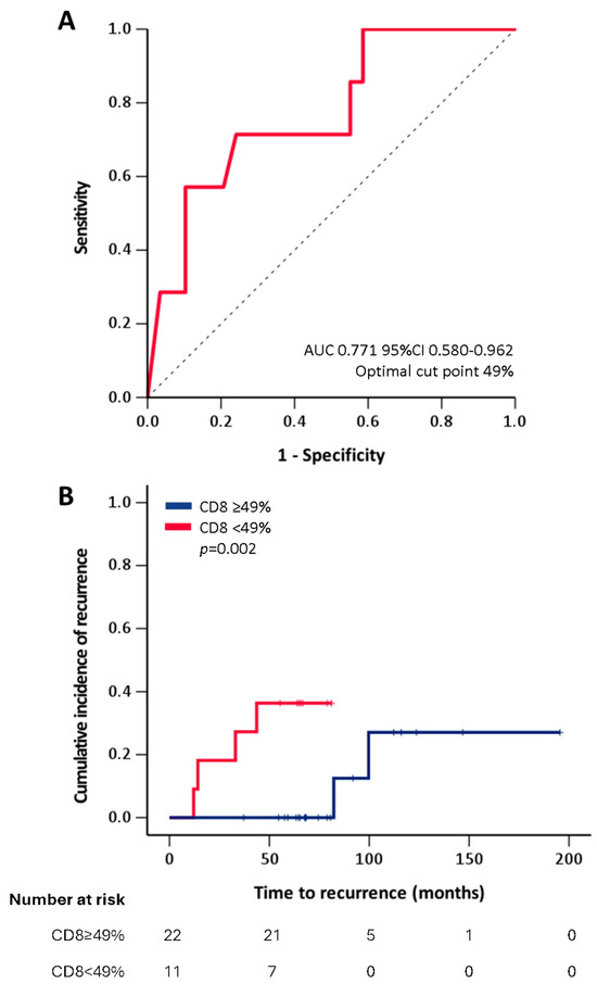 Receiver Operating Characteristics (ROC) curve analysis showing sensitivity and 1-specifity of percentage of CD8 positive cells versus disease recurrence (Panel (A)). Cumulative incidence of recurrence in patients with CD8 positive cells lower or higher than the cut-off (49%) identified in the ROC curve analysis (Panel (B)).