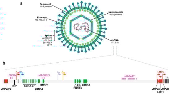 The EBV genome consists of a linear double-stranded DNA of 171.8 Kb in length, which encodes for more than 94 protein-coding genes (NCBI Reference Sequence: NC_007605.1) (Figure 1b). The nomenclature of the open reading frames (ORFs) is determined by their location with respect to the BamHI fragment. These ORFs are grouped into latent or lytic, and the lytic group is also subdivided into immediate early, early, and late. EBV also encodes non-coding RNAs (ncRNAs), including EBV-encoded RNAs or EBERs [11] and 44 mature miRNAs [12] (from 25 precursor miRNAs, according to https://www.mirbase.org/ accessed on 12/08/2024). The miRNAs are grouped into two clusters, depending on whether they are encoded within the BHRF1 or BART regions, known as ebv-miR-BHRF1 or ebv-miR-BART, respectively. The viral genome also contains 0.5 Kb terminal repeat sequences (TRs) located either at both termini [13,14] or within internal regions, which divide the genome into short and long unique sequences [15,16]. The repeats at the terminal regions serve as good markers to identify if specific EBV-infected cells derive from a common progenitor.