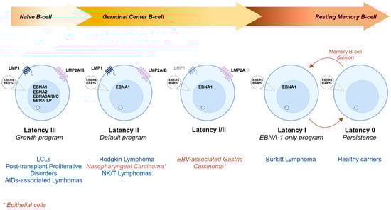 EBV latency programs and associated malignancies. After primary infection, the infected cell enters the Latency III program, also known as the growth program, expressing all latent genes, BARTs, and EBERs. This activates B cells promoting their transition toward a germinal center reaction and switching to Latency II or the default program, with a more restricted gene expression pattern. Finally, memory B cells exit the germinal center showing the Latency 0 program, also known as “Persistence”, in which only ncRNAs are expressed. Eventually, the transition from Latency 0 to Latency I (or the EBNA-1 only program) may occur when memory B cells proliferate so that the EBV episome is properly segregated to the daughter cells. In blue, EBV-associated lymphomas with their corresponding latency program. In red, EBV-associated epithelial malignancies and their corresponding latency programs are included. Created in BioRender. Garcia, L. (2024) BioRender.com/y04j261.