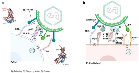 Molecules implicated in the interaction and entry of EBV with its host cell. (a) Scheme depicting EBV interaction with B cells. gp350/220 from the EBV envelope interacts with CR2 (or CR1), facilitating gp42 interaction with the HLA class II of the B cell surface. This triggers EBV fusion with the B cell membrane through gB to further deliver the virus genoma inside the cell. PDB: 8SM0 (structure of gp350/220 in complex with CR2). PDB: 1KG0 (Epstein–Barr virus gp42 bound to the MHC class II Receptor HLA-DR1). (b) Scheme depicting the EBV interaction with epithelial cells. gp350/220 or BMRF2 recognizing CR2 or β1-integrins, respectively. gH/gL interact with different β5, β6, and β8 integrins and MYH9 in the cell surface. gB, which drives the fusion with the cell membrane, interacts with NRP1. EPH2A binds both gH/gL and gB. Created in BioRender. Garcia, L. (2024) BioRender.com/y04j261.