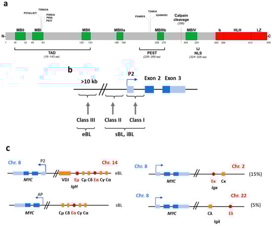 The oncogenic MYC transcription factor and its translocations within the different Ig loci found in Burkitt lymphoma. (a) Scheme of the MYC protein. The conserved boxes among MYC proteins are in green. The bHLHLZ domain is in red. The most prevalent mutations in BL are indicated. TAD, transactivation domain; PEST, degradation domain; NLS, nuclear localization signals. (b). Schematic representation (not to scale) of the breakpoints in the chromosome 8 in BL. The three exons of the MYC genes are the blue boxes, with the coding regions in darker blue. The major promoter, P2, is shown. The three classes of breakpoints with the chromosome 14 (immunoglobulin heavy chain genes) are indicated as class I, II, and III and the BL subtype where it is more prevalent. The breakpoint in the eBL typically occurs > 10 kb upstream of the first MYC exon and in the first noncoding exon or first intron in the sBL. (c) Schematic figures (not to scale) of prototypical translocations MYC::IGH to heavy chain genes (left schemes, 80% of the BL cases), MYC::IGK to light chain kappa genes (upper right scheme, 15%), and MYC::IGL light chain lambda genes (lower right scheme, 5%). In the t(8;14) translocation, the break points are the switch regions of the constant gene segments encoding the IgH isotypes and are upstream of MYC. In eBL, the breakpoint in the chromosome 14 is more frequently in the J segment. The predominant breakpoint in sBL occurs in the Cµ (M) regions of the H chain locus. In the t(2;8) and t(8;22) translocations, the kappa and lambda light chain lie far downstream of MYC. AP refers to an alternative promoter used in this type of translocations. The enhancers are denoted as red circles. Adapted from [163,170]. Partially Created in BioRender. Garcia, L. (2024) BioRender.com/y04j261.