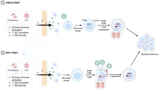 Together with EBV, there are other risk cofactors that contribute to the development of BL, some of which depend on the geographical location or genetic predispositions, and they vary depending on the BL subtype. Among them, chronic immune activation due to malaria or HIV infection is considered a high risk of BL development, especially malaria in eBL [174]. Repeated infections of Plasmodium falciparum (the parasite that causes malaria) during childhood in malaria-endemic regions together with the high incidence of EBV infection are directly associated with BL development. Chronic immune activation due to malaria weakens immune control over EBV and promotes B cell proliferation and EBV reactivation [175]. This environment of rapid B cell proliferation and increased germinal center formation increases the likelihood of oncogenic events, especially MYC translocations. The more the germinal center reactions, the higher the activation-induced cytidine deaminase (AID) activity. In the germinal center, AID is responsible for the somatic hypermutations (SHM) and class switch recombination (CSR) events needed for proper antibody diversification [176,177]. In BL, increased AID activity due to different factors, including chronic immune activation, leads to off-target breaks or errors, making IG::MYC translocations more likely [178]. Similar to malaria, the dysregulation of the immune system caused by HIV [179] increases the risk of developing BL (HIV+ individuals are at 10–100 times higher risk of developing BL compared to HIV− individuals). HIV-BL is more similar to sBL in terms of clinical and pathological features [155,180]. The mycotoxin aflatoxin B1 is a food contaminant more common in the African regions with higher EBV prevalence, and it has been shown to stimulate EBV-mediated transformation [181]. Recently, the secretion of the cytokine CCLC2 [182] and the downregulation of the TGB1 gene [183] have been shown as possible mechanisms to explain the aflatoxin B1 role in BL.