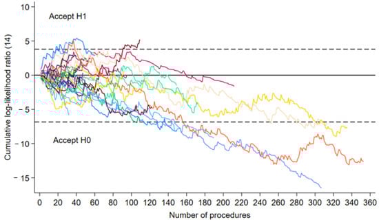 The sequential probability ratio test (SPRT) graphs of the 28 hospitals that performed at least 25 procedures are shown in Figure 1. To estimate the number of procedures from which a hospital achieved its learning curve, the SPRT curve had to cross the lower boundary line (h0), which had a value of −6.838 (α = 0.05, β = 0.2, odds ratio = 1.5). Among the 28 hospitals, eight hospitals achieved their learning curve as the graph crossed the lower boundary line. The learning curve threshold for the eight hospitals ranged from 94 to 174 procedures, with a median of 110 procedures. Based on a spline analysis using mixed-effects logistic regression, we found that the result was more or less the same, with a threshold of 110 procedures (Figure S1). The median number of procedures performed between 2019 and 2022 by the eight hospitals that reached the learning curve threshold was 248, with a minimum of 109 and a maximum of 353.