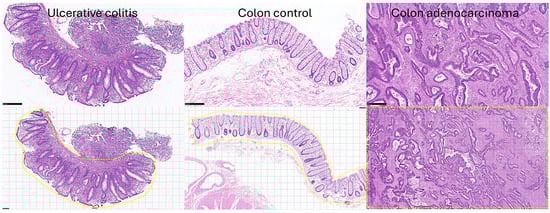 Histological types. Upper section: the three types of samples that were included in this study were ulcerative colitis (left), colon control (middle), and colorectal cancer (adenocarcinoma, right); original magnification 100×. Lower section: the whole-slide images were split into patches of 224 × 224 size (i.e., divided into multiple images of 224 px width and 224 px height). Only the diagnostic areas marked in yellow were used in the CNN analysis; original magnification 200×.