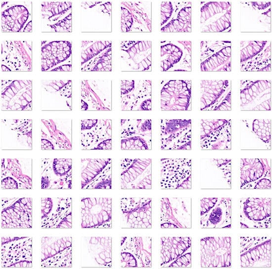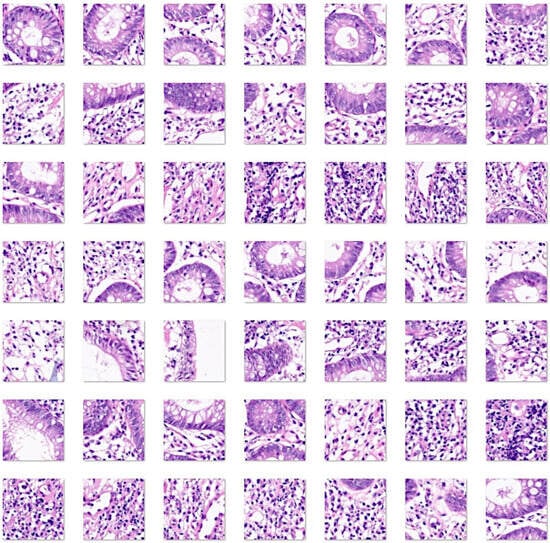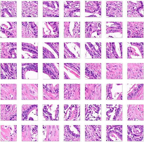 Images of colorectal cancer (adenocarcinoma). Original magnification 200×. Whole-slide images were split into patches of 224 × 224 size. Adenocarcinoma of the colon is a glandular neoplasm that accounts for approximately 98% of all colonic cancers. Patients with inflammatory bowel disease, polyposis, and Lynch syndrome [98,99] are at a higher risk of developing colorectal cancer. Most cases display high or moderate differentiation of the carcinoma glands accompanied by marked growth of the fibrous connective tissue, known as desmoplasia [100,101]. The glands can show a cribriform pattern and are filled with necrotic debris. Adenocarcinomas are characterized by epithelial cells with stretched and stratified nuclei, which create complex glandular structures. The nuclei exhibit polymorphism and loss of polarity. The tumor immune microenvironment exhibits variable infiltration of inflammatory cells. There are several recognized subtypes, including adenoma-like, adenosquamous, mucinous, micropapillary, signet-ring, serrated, and sarcomatoid [93,101,102,103,104,105,106,107].