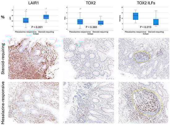 The clinicopathological characteristics of the series are shown in Table 4. The number of cases in the series was 35, with a mean age of 38.4 years and a male/female ratio of 20/35. Most of the biopsies were from the rectum, which was the most pathological area. Most cases had an endoscopic Baron score of 1 and 2. The most frequent histologic Geboes scores were 2 to 4. In comparison to mesalazine-responsive ulcerative colitis, the steroid-requiring type was characterized by higher protein expression of LAIR1 (20.74% ± 7.48 vs. 28.18% ± 6.26, p = 0.001) and lower TOX2-positive cells in the isolated lymphoid follicles (ILFs) (11.74% ± 3.47 vs. 7.03% ± 5.03, p = 0.019) (Table 4 and Figure 5).