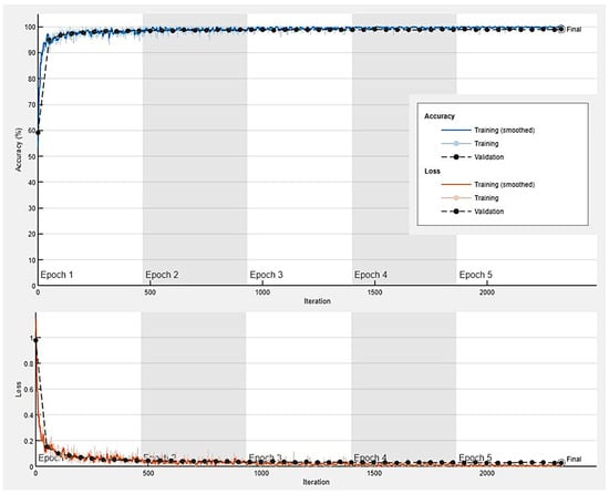 Data normalization was applied to the input images as previously described [71]. The code was run in the MATLAB programming language and the numeric computing environment (R2023b, update 9 released 30 July 2024, MathWorks, Natick, Apple Hill Campus, 1 Apple Hill Drive, Natick, MA 01760-2098, USA), as we have recently described [71]. The input size was 224-by-224 (224 × 224 × 3). In summary, the code loaded the pre-trained CNN, replaced the final layers, trained the network, made predictions, assessed the accuracy, and deployed the results. The design and training parameters of the CNN are listed in Table 2.