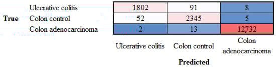Transfer learning using the pre-trained ResNet-18 CNN was used to classify the image patches of ulcerative colitis, colorectal cancer (adenocarcinoma), and colon control. The data (image patches) were partitioned into a training set (70% of the images) to train the network, a validation set (10%) to test the performance (accuracy and loss) of the network during training, and a test set (20%) as a holdout (new data) to test the performance on new data. The network performance during training and validation is shown in Figure 6. The network achieved high accuracy and low loss during the first 100 iterations.