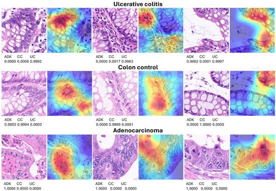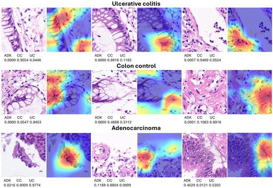 Explanation of network predictions using Grad-CAM. Grad-CAM was used to visualize which regions of the image were important for the classification decision (diagnosis) of the network. The most relevant regions are highlighted in red (jet colormap). The prediction scores for each diagnosis are shown below each hematoxylin and eosin (H&E) image. ADK, adenocarcinoma (colorectal cancer); CC, colon control; UC, ulcerative colitis. Original magnification 200× (whole-slide images were split into patches of 224 × 224 size).
