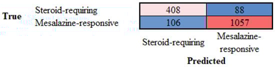 Ulcerative colitis can be divided into two clinical groups based on the requirement for steroids to control colon inflammation, as described in Section 3.3. The analysis of H&E highlighted the importance of both the epithelial and inflammatory components. LAIR1 is a new marker of the immune microenvironment and an immuno-oncology target. Therefore, transfer learning from ResNet-18 was performed to predict and classify the LAIR1 images of ulcerative colitis into the two subtypes of steroid-requiring (“aggressive”) and mesalazine-responsive (“benign”). In the test set, the accuracy was 88.31%. The confusion matrix is shown in Figure 11, and the network performance is shown in Table 7.