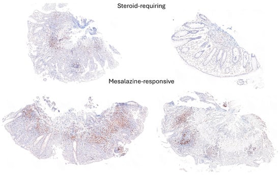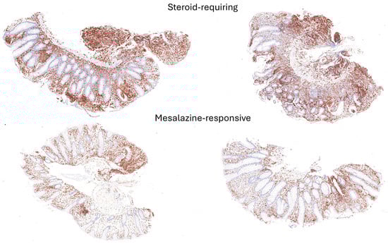 Examples of steroid-requiring and mesalazine-response ulcerative colitis and characteristic LAIR1 immunohistochemistry are shown in Figure 11. Evaluation of the whole-tissue images of LAIR1 showed that steroid-requiring patients had a more prominent inflammation of the lamina propria, as shown in Figure 12 and Figure 13.