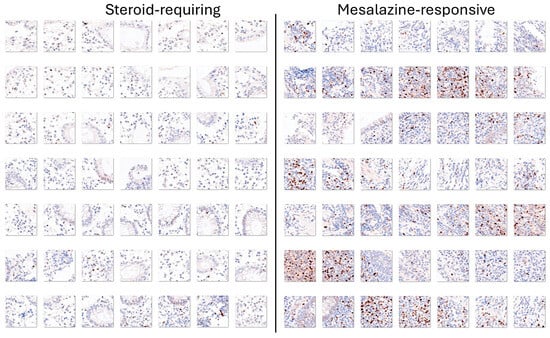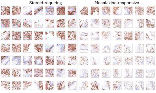 Examples of the split images of LAIR1 immunohistochemistry in the ulcerative colitis dataset. The split images were used as input data in the CNN, which managed to classify between steroid-requiring and nonsteroid-requiring/mesalazine-responsive ulcerative cases. Overall, the inflammatory component was higher in the steroid-requiring cases. Original magnification 200× (whole-slide images were split into patches of 224 × 224 size).
