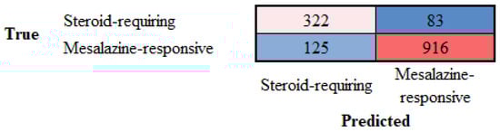 Ulcerative colitis can be divided into two clinical groups based on the requirement for steroids to control colon inflammation. Transfer learning from ResNet-18 was performed to predict and classify the H&E images of ulcerative colitis into the two subtypes of steroid-requiring (“aggressive”) and mesalazine-responsive (“benign”). In the test set, the accuracy was 79.53%. The confusion matrix is shown in Figure 10, and the network performance is shown in Table 6.