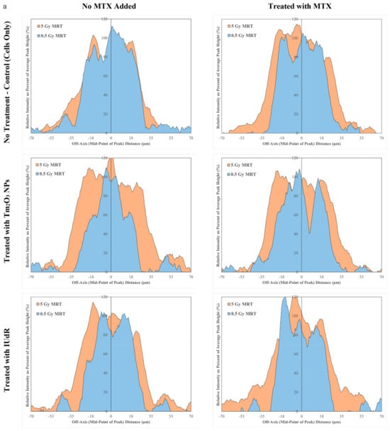 MRT beam profiles and peak widths expressed via γH2AX foci. (a) Beam profiles from 20× dry confocal microscopy images of MRT peaks for each treatment at both 0.5 Gy (blue) and 5 Gy (orange) (MRT doses listed are the prescribed valley doses) are shown to reveal peak broadening, with the left column showing MTX-negative treatments and the right showing MTX-positive treatments. These data are expressed as a histogram showing intensity as a percentage of the average peak (of the MRT peak) intensity vs. the off-axis lateral distance in microns. Radiation-only MRT is shown in the top row, followed by TmNP treatments in the middle and IUdR treatments at the bottom. (b) Peak widths are shown to quantify broadening results in subfigure (a) and are the average of the profile data across 16 peak segment ROIs taken across independent repeats.