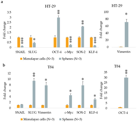 3.2. Expression Levels of EMT and Stemness Genes Change Between Adherent Cells and Colonospheres