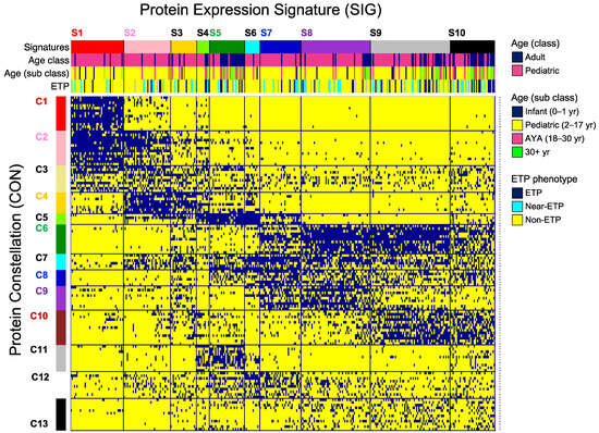 Meta-Galaxy analysis. A large binary matrix representing the 361 patients (columns) and 125 protein clusters (PC) (rows, Supplemental Table S3). A blue pixel indicates the presence of a given PC in that patient. Block clustering analysis identified the presence of 13 protein constellations (horizontally) that formed 10 protein expression signatures (vertically). Annotations are included at the top for each individual patient. Age (class): adult (navy blue), pediatric (pink); age (subclass): age (≤1 year, navy blue), pediatric (2–17 years, yellow), adolescents and young adults (pink), adult (30+ years, green); ETP phenotype: ETP (navy blue), near-ETP (light blue), non-ETP (yellow).