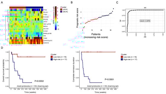 Univariable analysis followed by multivariable Lasso Cox regression analyses were applied to the training set and identified 15 proteins that significantly contributed to CR duration (Figure 2A) with high expression of TGM2, EIF4G2, FOXO3A, and BCL2L1 and phosphorylated CDKN1B.pS10 being associated with higher risk, whilst high expression of PTEN, CCND1, and XPA were three of the protein markers associated with low took out remission risk. Using the regression coefficients of the generalized linear model, a risk score was calculated for each individual patient to stratify patients into a low-risk protein cluster (LR-PC) and a high-risk protein cluster (HR-PC) based on the median cut-off value of the risk score among all adult patients (Figure 2B). Time-dependent receiver operator characteristic (ROC) analysis assessed the predictive performance of the risk score, yielding an area under the curve (AUC) of 0.97 (Figure 2C). The robustness of the risk groups based on the risk score was validated in the test set with an AUC of 0.77 (Supplemental Figure S4). OS and CR duration were significantly associated with the risk-assigned protein clusters (OS, LR-PC: median not reached (NR) vs. HR-PC: median 106 weeks, p < 0.001; CR duration, LR-PC: median NR vs. HR-PC: median 57 weeks, p < 0.001, respectively) (Figure 2D). Clinical variables did not differ between the two risk protein clusters, including age, white blood cell (WBC) count, sex, ethnicity, and ETP phenotype.