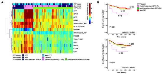 ETP clusters were clearly associated with age groups (p < 0.001), with one cluster that was dominated by adult ETP patients (ETP-A) (navy blue; n = 15/20), one cluster that included mostly pediatric patients (ETP-P) (pink; n = 13/15) and one protein cluster that was comprised of both adult and pediatric patients (ETP-MX) (green; pediatric (n = 45/68), adult (n = 23/68)) (Supplemental Figure S6C). ETP and near-ETP cases were found proportionally distributed in all three clusters and had highly similar protein expression patterns, suggesting that they are very similar at the proteomic level. Furthermore, ETP vs. near-ETP cases had similar outcomes in the cluster (Supplemental Figure S6D–G). Based on relatively similar protein levels, as well as OS between near-ETP and ETP patients, ETP and near-ETP were combined for the analysis (n = 103). Model-based clustering using finite mixture models was applied, and differential expression analysis was performed for each cluster separately compared to non-ETP T-ALL samples, which identified 14 proteins that most strongly discriminated between the three clusters (Figure 3A). PI3K/Akt signaling proteins (AKT1, AKT3 IGF1R, and PIK3CB) had the highest relative expression among patients in ETP-P, SMAD5-pS463_465, and RICTOR-pT1135 were high both in ETP-A and ETP-P. Histone 3 expression was highest among patients in ETP-MX. The clinical outcome of pediatric/AYA patients treated on the AALL1231 trial with an ETP-P protein profile (Figure 3B, pink) was inferior compared to the pediatric/AYA patients in the ETP-MX (Figure 3B, light green), which had similar outcome to the non-ETP T-ALL counterpart (Figure 3B, red). Clinical characteristics were similar between the ETP-P and ETP-MX patients, except for WBC count, which was lower among patients that fell in the ETP-P (Supplemental Table S4). Among adult patients, the ETP clusters were not prognostic (Supplemental Figure S7).