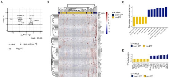 Gene expression profiling comparing near-ETP/ETP to non-ETP T-ALL. (A) Volcano plot displaying differentially expressed genes between near-ETP/ETP and non-ETP patient samples. Genes shown in red have an FDR p-value < 0.05 and an absolute log2 fold change greater than 2.5, blue points indicate genes with an FDR p-value < 0.05 and an absolute log2 change less than 2.5, and green and grey points represent non-significant genes. (B) Heatmap showing differential gene expression with a log2FC cut-off greater than 1.5. fold difference between variance stabilizing transformation normalized RNA expression counts in near-ETP/ETP and non-ETP T-ALL. (C) The FGSEA enrichment scores for pathways upregulated in the near-ETP/ETP are shown in blue, while those shown in yellow are down-regulated. (D) Transcription factor activities and transcription factors between near-ETP/ETP and non-ETP. TF activity estimates are based on the normalized gene counts (y-axis).