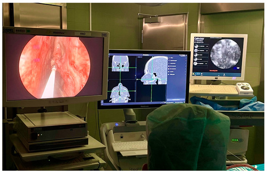 Intraoperative setup from the surgeon’s perspective, arranged from left to right. The endoscopic image shows the laser probe positioned on the inferior turbinate, electromagnetic navigation system (Stealth Station®, Medtronic, Jacksonville, FL, USA), and confocal laser endomicroscope (Cellvizio®, Mauna Kea Technologies, Paris, France).