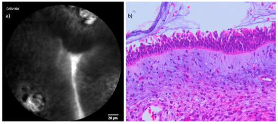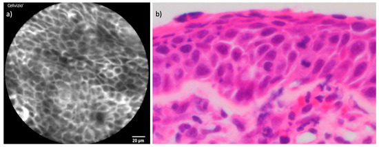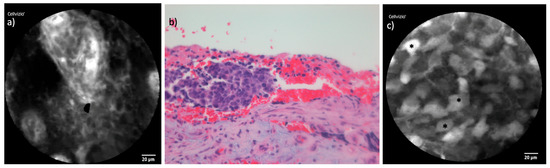 The use of CLE in the head and neck region has been most extensively studied in SCC [23]. Numerous studies have identified consistent malignancy criteria for SCC using CLE, including tissue homogeneity, cell size, cell borders, clustering, capillary loops, and fluorescein leakage [24,25,26].