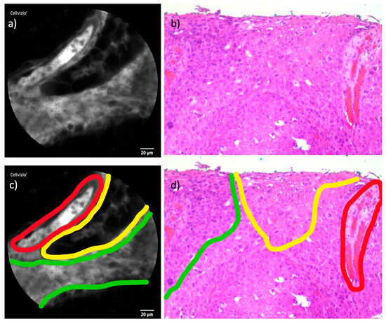 Comparison of CLE and histopathological cross-section in SCC: (a) CLE image of an endonasal SCC with blurry cell borders, irregular cell configuration, and inhomogeneous distribution of fluorescein. (b) Corresponding histopathological cross-section H&E staining. (c,d) Highlighted parallels in both modalities: red: cross-section of capillary, yellow: area of tumor necrosis without contrast enhancement, green: tumor cells with contrast enhancement.