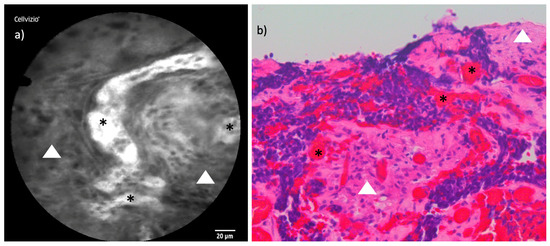 Comparison of CLE and histopathological cross-section in SNUC: (a) CLE image of an endonasal SNUC with an increased number of irregularly shaped, cluster-forming capillaries (*) in contrast to less contrasted stromal desmoplasia (white triangles). (b) Corresponding histopathological cross-section H&E staining.