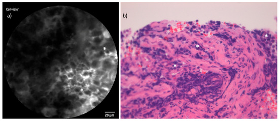 Comparison of CLE and histopathological cross-section in ONB: (a) CLE image of ONB with tumor clusters of small spheric cells (white *). (b) Corresponding histopathological cross-section H&E staining showing the typical small round blue appearance of the tumor cells (white *).