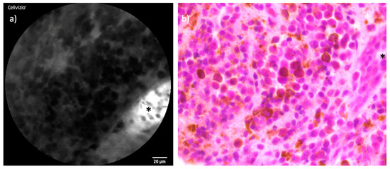 Comparison of CLE and histopathological cross-section in SNMM: (a) CLE image of one of the included SNMM with small round cells and a cross-section of a capillary (*). (b) Corresponding histopathological cross-section H&E staining showing the highly similar round cellular shape. The brown melanin pigment is not detected in the CLE image.