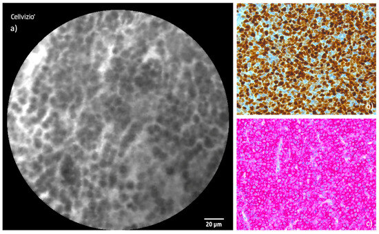 The examination of the SL presented challenges due to the tumor’s soft and easily disintegrating consistency, which made probe stabilization more difficult during CLE imaging. Despite this, the cellular shape observed in CLE images was uniformly spherical, correlating well with the histological findings. Notably, the uniform accumulation of these cells was a unique feature among the cohort, distinguishing the lymphoma from other tumor types examined in this study. Figure 10 displays the juxtaposition of CLE and histological images with immunostaining.