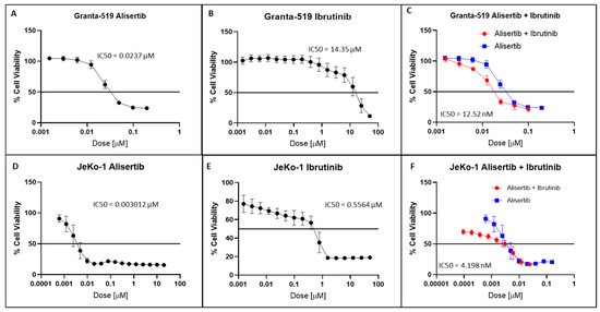 MTS cell proliferation assay of MCL cell lines ((A–C) Granta-519; (D–F) JeKo-1). (A) IC50 of alisertib = 23.7 nM. (B) IC50 of Ibrutinib = 14,350 nM. (C) Leftward shift of concentration–effect curve for alisertib plus ibrutinib indicates significant synergism with an IC50 = 12.52 nM. (D) IC50 of alisertib = 3.01 nM. (E) IC50 of ibrutinib = 556.4 nM. (F) Ibrutinib and alisertib are synergistic in JeKo-1 inhibition.