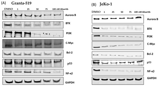Western blotting of alisertib-treated Granta-519 (Figure 2A) and Jeko-1 (Figure 2B) MCL cells showed increased protein levels of AK-B and p53, likely a response to impending apoptosis. In contrast, decreased levels of PI3K, BTK, c-Myc, and Bcl-2 with increasing doses of alisertib ameliorated signaling through the chronic active BCR pathway. This is indicative of MCL cells’ impending loss of viability. AK-A inhibition in both ibrutinib-insensitive Granta-519 and ibrutinib-sensitive Jeko-1 cells amplified the effect on NF-kβ inhibition (Figure 2), a final common pathway of BTK inhibition, promoting apoptosis and inhibiting cell proliferation.