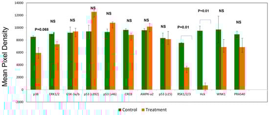 Alisertib treatment (1 µM) for 1 week caused a significant decrease in phosphorylated RSK1/2/3 and Hck (p = 0.01) and a modest reduction in p38 phosphorylation (p = 0.068) (Figure 3). In contrast, none of the p53 phosphorylation sites were affected by alisertib; hence, DNA damage response (p53 Ser-15 phosphorylation), transcription-dependent and -independent apoptosis (Ser-46 phosphorylation), and mitochondrial translocation- and transcription-independent apoptotic function were unaffected.