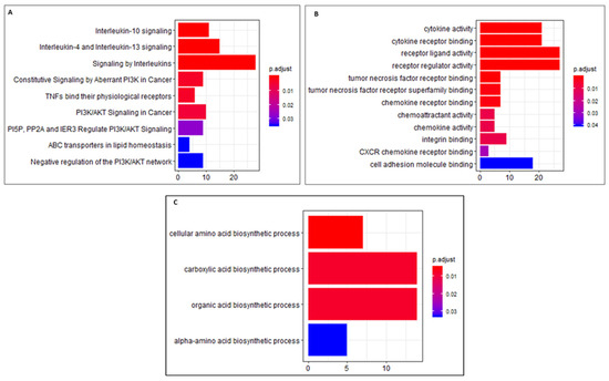 Gene expression profiling of the alisertib-treated versus control cells showed differential expression of 764 genes, of which 523 genes (68%) were upregulated and 221 genes (32%) were downregulated. The enrichment analysis of pathways for upregulated genes upon alisertib treatment revealed changes in interleukin signaling followed by PI3K/AKT (Figure 4A). Many interleukins and cytokines that arose due to the response to cell stimulus were upregulated, and these bound to cell surface receptors to initiate signaling responses. Enrichment of genes that belonged to the MAPK pathway was not found. PIK3R3 (phosphoinositide-3-kinase regulatory subunit 3), one of the regulatory subunits of PI3K, was upregulated and had a role in multiple signaling activity driven by stimulation of receptors. FGF2 (fibroblast growth factor 2), CD28, and TRAT1, which also triggered PI3K activity, were upregulated too. But there was no evidence of AKT signaling pathway activation. There was a change in genes that were part of the PI3K/AKT signaling process, but there might have been a disruption in signaling due to phosphatases. Gene ontology enrichment analysis showed differential effects on cytokine and chemokine activity, as well as their receptors and cell adhesion molecules (Figure 4B). This confirms the enrichment of the same molecules that we detected in pathway analysis. Regarding the list of downregulated genes, we found that amino acid and organic acid biosynthetic processes were affected (Figure 4C).
