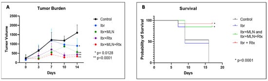 Granta-519 xenograft SCID mouse model of MCL. (A) Tumor growth inhibition: N = 12 mice per cohort treated with ibrutinib, ibrutinib plus alisertib, ibrutinib plus rituximab, and triple therapy versus control. On day 14, the differences between the tumor burdens of the control group and each of the treatment groups were statistically significant (GraphPad Prism version 8.4.1). (B) Kaplan–Meier survival curves of control vs. ibrutinib vs. ibrutinib + alisertib vs. ibrutinib + rituximab and ibrutinib + alisertib + rituximab. There was no significant difference between control and ibrutinib-treated mice (p = 0.6258). There was a significant difference between the control and doublet- and triplet-treated mice (** p < 0.0001) and between the ibrutinib- and combination-treated mice (* p < 0.0001). There was no significant difference between the different combination treatments (p ≥ 0.589). p-values were determined by log-rank analysis.
