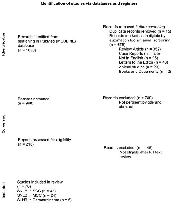 Based on the established keywords, the primary research yielded a total of 1688 articles. These were compared to the selection criteria. By using PubMed’s automatic search tools and manual screening, 352 reviews and meta-analyses, 155 case reports, 95 articles not written in English, 48 letters to the editor, 23 animal studies, and 2 books/documents were excluded. Fifteen duplicates were also excluded. The remaining articles were assessed for relevance based on their titles and abstracts; as a result, 218 potentially eligible original articles were selected and fully reviewed. Of these, 148 articles that were not relevant to the aim of this study were excluded. Finally, 70 articles met the selection criteria and were included in this review (Figure 1). These were classified into studies reporting SLNB for SCC (n. 42, Table 1), studies on SLNB for MCC (n. 24, Table 2), and studies on SLNB for Porocarcinoma (n. 6, Table 3).