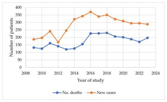 Figure 1 shows an upward trend in new cases from 2009 to 2016, peaking at 370 and then stabilizing with slight fluctuations, ending at 288 in 2023. Deaths also fluctuated, peaking in 2018 at 230 but gradually declining to 170 in 2022 before a small rise to 197 in 2023. The increasing cases with relatively stable or decreasing deaths suggest potential improvements in treatment, early detection, or patient management, reflecting better survival rates over time.