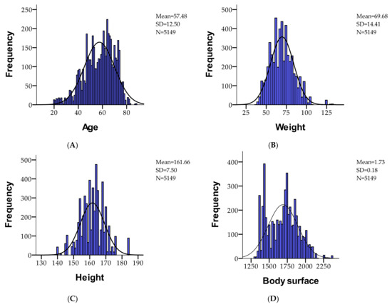 Table 2 provided descriptive statistics for several variables, including LVEF (a respiratory function metric), heart problems, age, weight, height, body surface area, and a performance index, based on a dataset of 5149 valid cases with no missing data. The mean LVEF is 0.9598, with a standard deviation of 0.19645, indicating a strong left-skew (−4.683) and a high kurtosis (19.937). Heart problems occur in about half the cases (mean = 0.5053), and the participants have an average age of 57.48 years (SD = 12.51). The average weight is 69.68 kg (SD = 14.41), height is 161.66 cm (SD = 7.51), and body surface area is 1.73 m2 (SD = 0.18). The performance index has a mean of 0.6059, with a relatively low skew (−0.085) and kurtosis of −1.225, indicating some variability in these measures. The ranges for age, weight, height, and body surface area show significant variation, and skewness and kurtosis highlight the distributional characteristics of each variable. The demographic description of the study cohort regarding age, weight in kg, height in cm, and body surface in kg/m2 is presented in Figure 2.