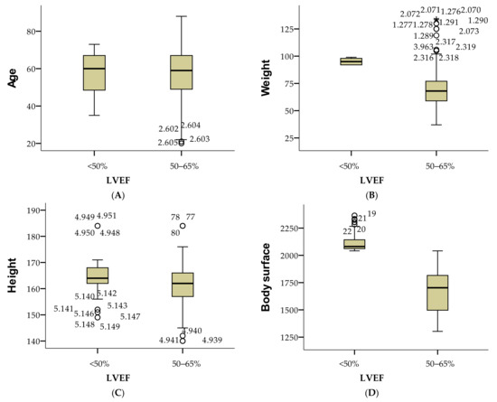 Comparison of health metrics by LVEF categories as age (A), weight (B), height (C), and body surface (D).