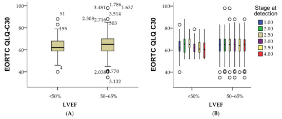 Boxplot presentation of the variation in quality of life in patients according to LVEF per cohort (A) and according to cancer stages (B), ○ = isolated cases.