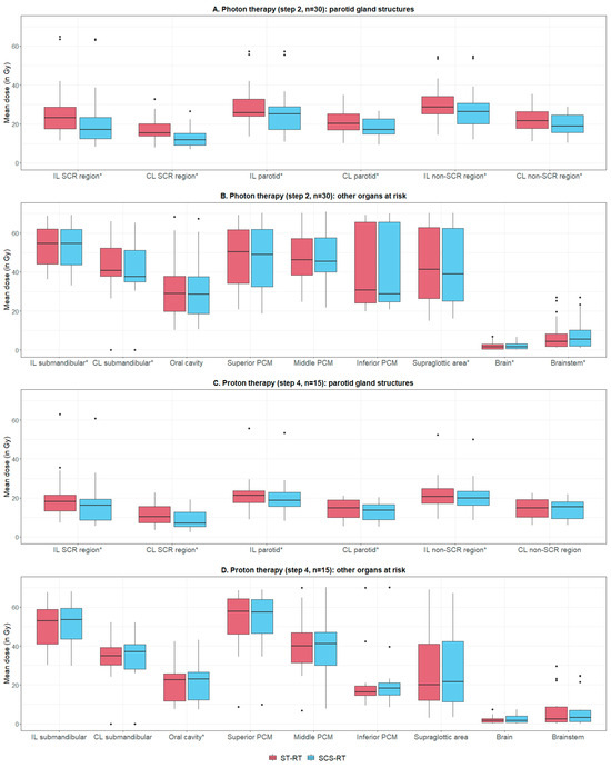 Dose shifts with photon (step 2) and proton therapy (step 4). Abbreviations: CL = contralateral (i.e., receiving lowest dose); IL = ipsilateral (i.e., receiving highest dose); non-SCR = remaining parotid gland tissue (i.e., parotid gland minus SCR region); PCM = pharyngeal constrictor muscle; RT = radiotherapy; SCR = stem cell rich; SCS = stem cell sparing; ST = standard. * Significant according to Wilcoxon signed-rank test (significance level of p < 0.05).