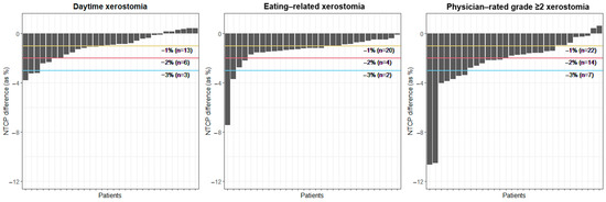 Overall, median Dmean,SCR reductions of 4.1 and 3.5 Gy were achieved for ipsilateral and contralateral, respectively (p < 0.001, Figure 1, Table S6, and Figure S1). Mean doses to the parotid glands and non-SCR regions were also reduced (p < 0.001), since objectives for all parotid gland structures were included during optimization based on the recommendations (Table 2). At a population level, the estimated clinical impact on several xerostomia outcomes was significant (p < 0.001, Table S7). More specifically, if ≥2% NTCP reduction is considered clinically relevant, SCS-RT was predicted to decrease daytime xerostomia, eating-related xerostomia, and physician-rated grade ≥ 2 xerostomia in 6 (20%), 4 (13%), and 14 (47%) of the patients, respectively (Figure 2).