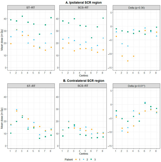 To describe the differences in mean OARs dose and NTCPs between SCS-RT and ST-RT, descriptive statistics were calculated and presented as median (range). The Friedman test was used to test whether achieved dose differences varied between RTTs and centers (steps 1 and 3). Changes in mean dose to the SCR regions/other OARs and in NTCPs were evaluated using the Wilcoxon signed-rank test (steps 2 and 4). Spearman’s rho was used to correlate selected features with the percentage SCR region dose reduction (step 2). Differences were considered significant at p < 0.05. Analyses were performed using IBM Statistical Package for Social sciences version 28.