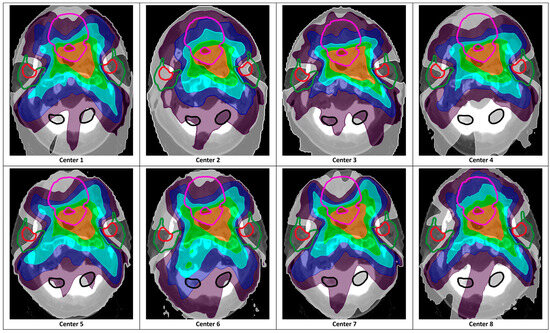 In general, dose shifts to other OARs due to SCS-RT were limited (Table S9). Moreover, no significant differences were observed between the centers, except for Dmean to the brainstem (p = 0.05). However, these were considered not clinically relevant (ranging from −0.5 to 0.9 Gy, Tables S9 and S10).