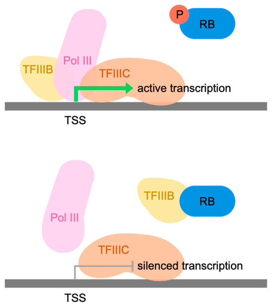 - Chu, W.-M.; Wang, Z.; Roeder, R.G.; Schmid, C.W. RNA polymerase III transcription repressed by Rb through its interactions with TFIIIB and TFIIIC2. J. Biol. Chem. 1997, 272, 14755–14761. [Google Scholar] [CrossRef]