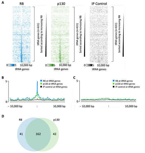 Chicas et al. [102] conducted ChIP-seq analyses of endogenous RB and p130 in IMR90 human diploid fibroblasts. When these data were searched for tDNA loci, heatmaps revealed a concentration of both pocket proteins at a subset of tRNA genes, relative to 10 kb of flanking DNA upstream and downstream (Figure 2A). In each heatmap, the tDNAs are arranged in order of increasing RB signal (top to bottom) and it is apparent that most cases of p130 occupancy overlap with that of RB. Average signal intensity plots confirm the selective localization of RB and p130 at tDNAs, relative to the surrounding regions (Figure 2B). Specificity is demonstrated by the minimal association with miRNA and snoRNA genes (Figure 2C). Approximately 80% of the tDNAs that recruit RB also recruit p130, but these pocket proteins were also each found individually at subsets of tDNAs where the binding of the other did not reach the threshold (Figure 2D). The third pocket protein, p107, can also be detected at a subset of tDNAs in IMR90 cells (Supplementary Figure S1).