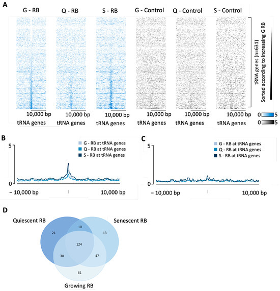 RB binding in growing, quiescent or senescent IMR90 cells. (A) Heatmaps depicting RB (blue) or no-antibody control (black) binding 10 kb either side of hg38 tRNA genes in growing (“G”), quiescent (“Q”) or senescent (“S”) IMR90 cells. In each heatmap, the tDNAs are sorted (top to bottom) in order of increasing RB signal in the growing cells. (B,C) Average signal intensity of RB (B) or control (C) enrichment at tRNA genes in growing, quiescent or senescent IMR90 cells. (D) Overlap in RB binding at tRNA genes in growing, quiescent, or senescent IMR90 cells.