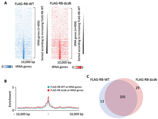 Phosphorylation by cyclin-dependent kinases (CDKs) has been shown to regulate the conformation, interactions and activity of RB [2,33,37]. Sanidas et al. [37] created a mutant form of RB, termed RB∆cdk, in which all fourteen known CDK phosphoacceptor sites were substituted with alanine residues that cannot be phosphorylated; they then replaced endogenous RB in BJ cells with a FLAG-tagged version of this phospho-resistant mutant, expressed at similar levels. We analyzed their ChIP-seq data [101] to determine if ablating CDK-mediated phosphorylation affects the recruitment of RB to tRNA genes. Indeed, binding was enhanced by the mutations (Figure 4A,B). As well as causing stronger association in the majority of cases, the mutations also altered a few cases of tDNA selection so that recruitment to subsets of tDNAs was either increased or decreased (Figure 4C). However, most tDNAs bound by wild-type RB were also bound by RB∆cdk and vice versa.
