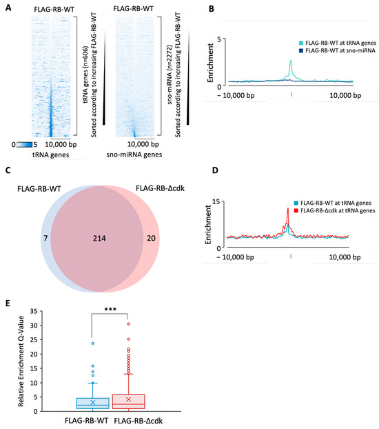 Sanidas et al. adopted the same approach in RPE1 human retinal pigment epithelial cells, replacing the endogenous RB with similar levels of flag-tagged wild-type or RBΔcdk mutant [37,101]. Use of retinal epithelial cells is particularly apposite as inherited mutations in the RB1 gene cause oncogenic transformation of this cell type early in life [1]. As in fibroblasts, RB binds selectively to many tRNA genes in RPE1 cells but is only detected at a small minority of miRNA and snoRNA genes (Figure 5A,B). Nearly all tRNA genes bound by wild-type RB are also bound by the RB∆cdk mutant (Figure 5C). However, occupancy of tDNA loci is, in many cases, strengthened significantly by the phosphoresistant mutations (Figure 5D,E).
